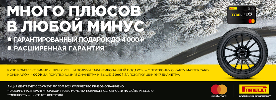 Купи комплект летних шин Pirelli от 16-го диаметра в «Центре шин» и получи гарантированный подарок – платежную карту Mastercard на сумму от 2 000 до 4 000 рублей!
